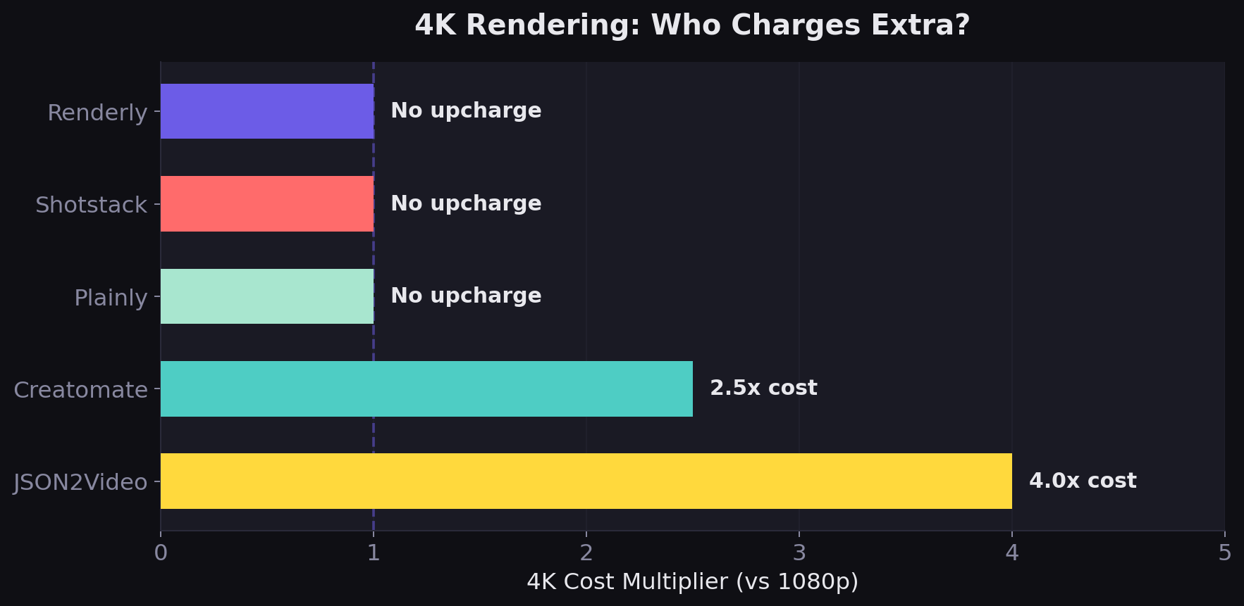 Renderly and Shotstack stand out here by charging the same rate regardless of output resolution. If 4K is part of your workflow, this alone can shift the cost comparison significantly.