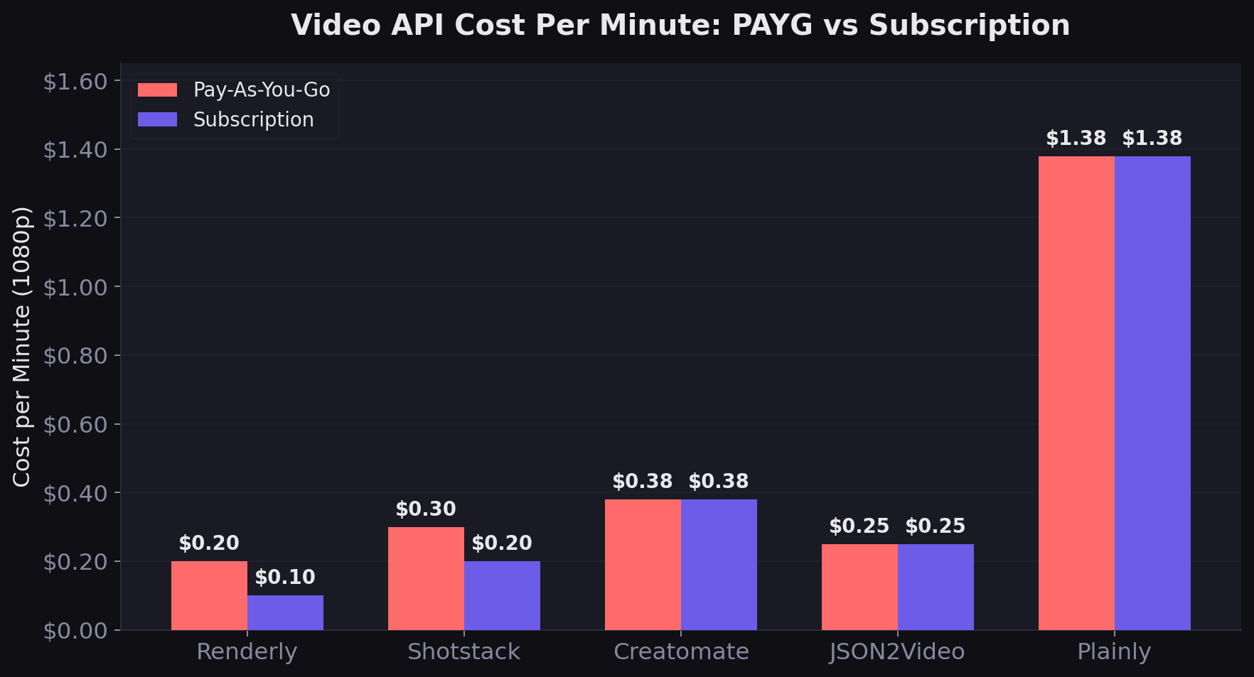 | Renderly | PAYG + subscription | $0.20/min PAYG | Cost-sensitive teams |