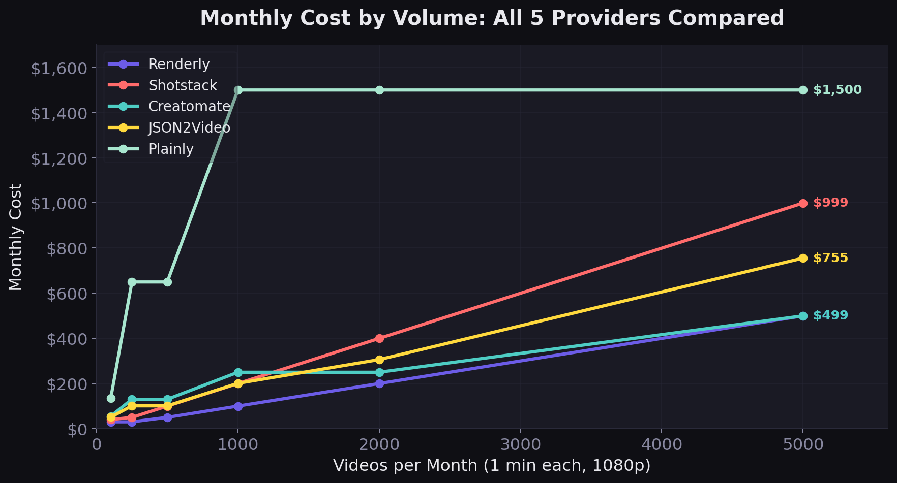 We compared pricing across 5 video rendering APIs at real production volumes. At 1,000 videos/month, costs range from $200 to $1,380 depending on the provider.